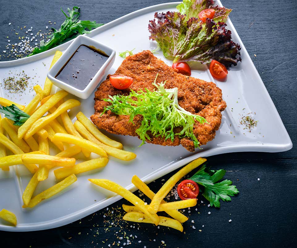 – Pariški zrezek,pražen krompir,solata (vsebuje alergen:gluten,jajca,mleko)